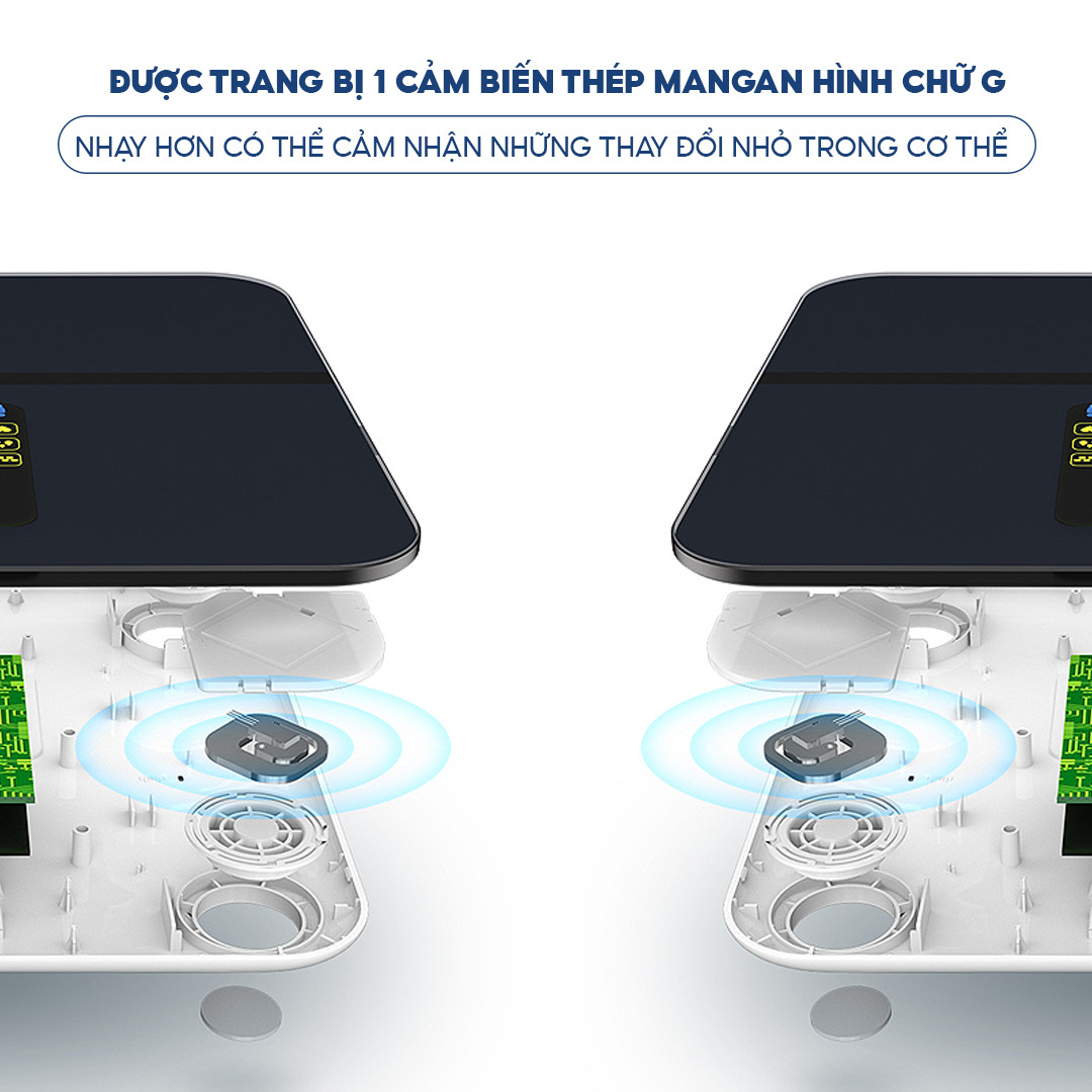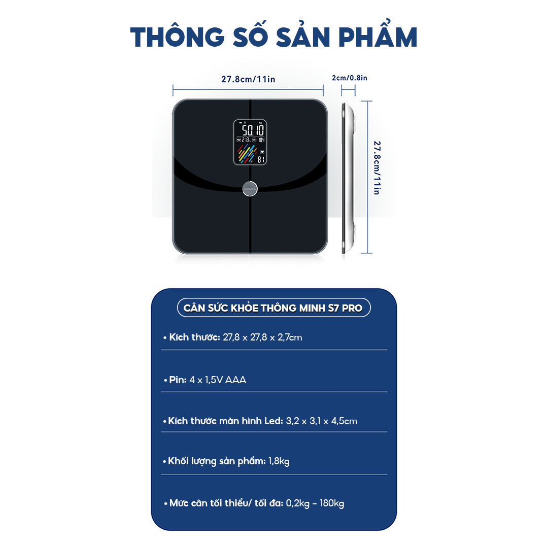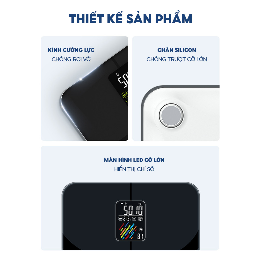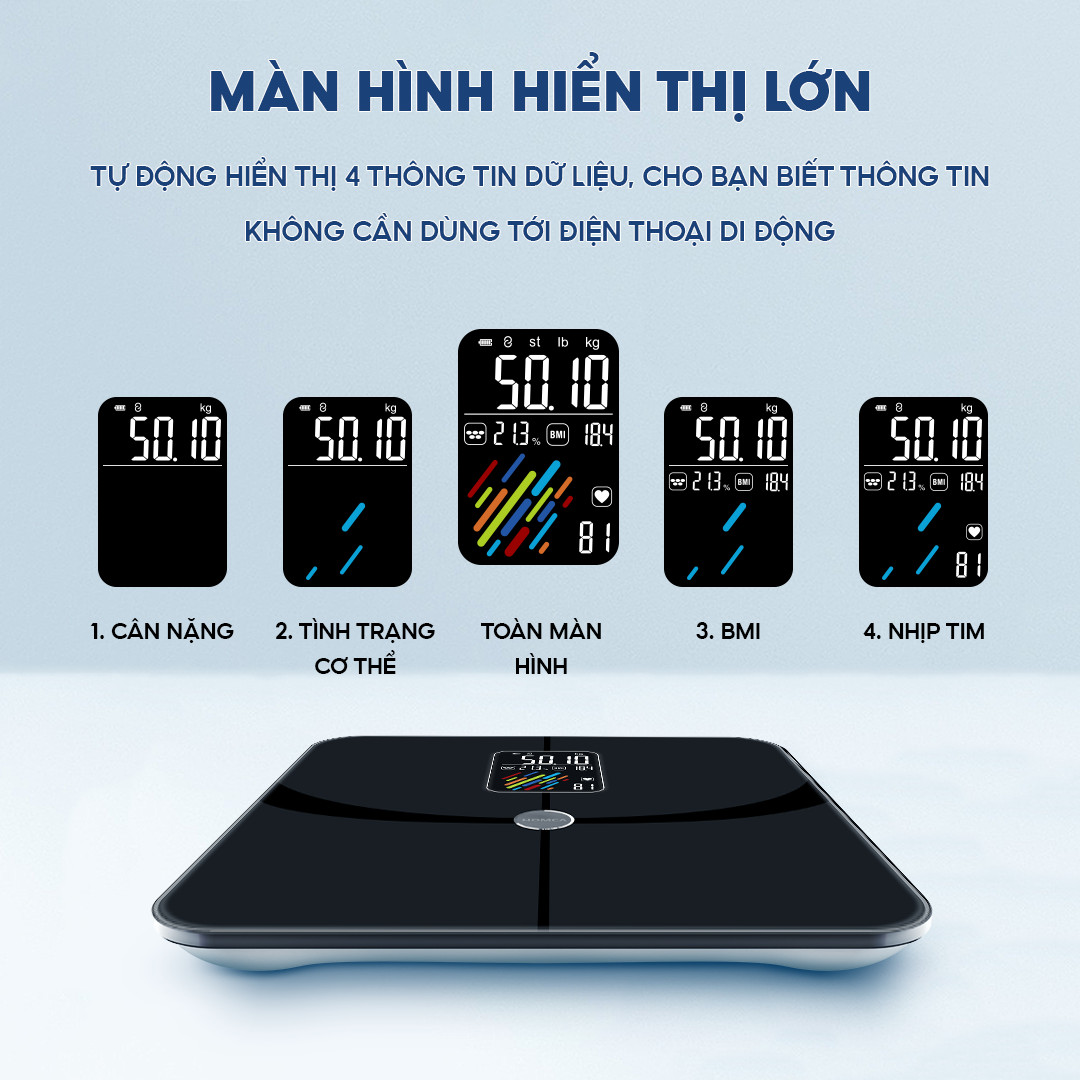 - Cân thiết kế hiện đại, sang trọng, màn hình LCD lớn (7.5 x 3.5cm) hiển thị 4 chỉ số: cân nặng, nhịp tim, % nước, BMI, tình trạng cơ thể