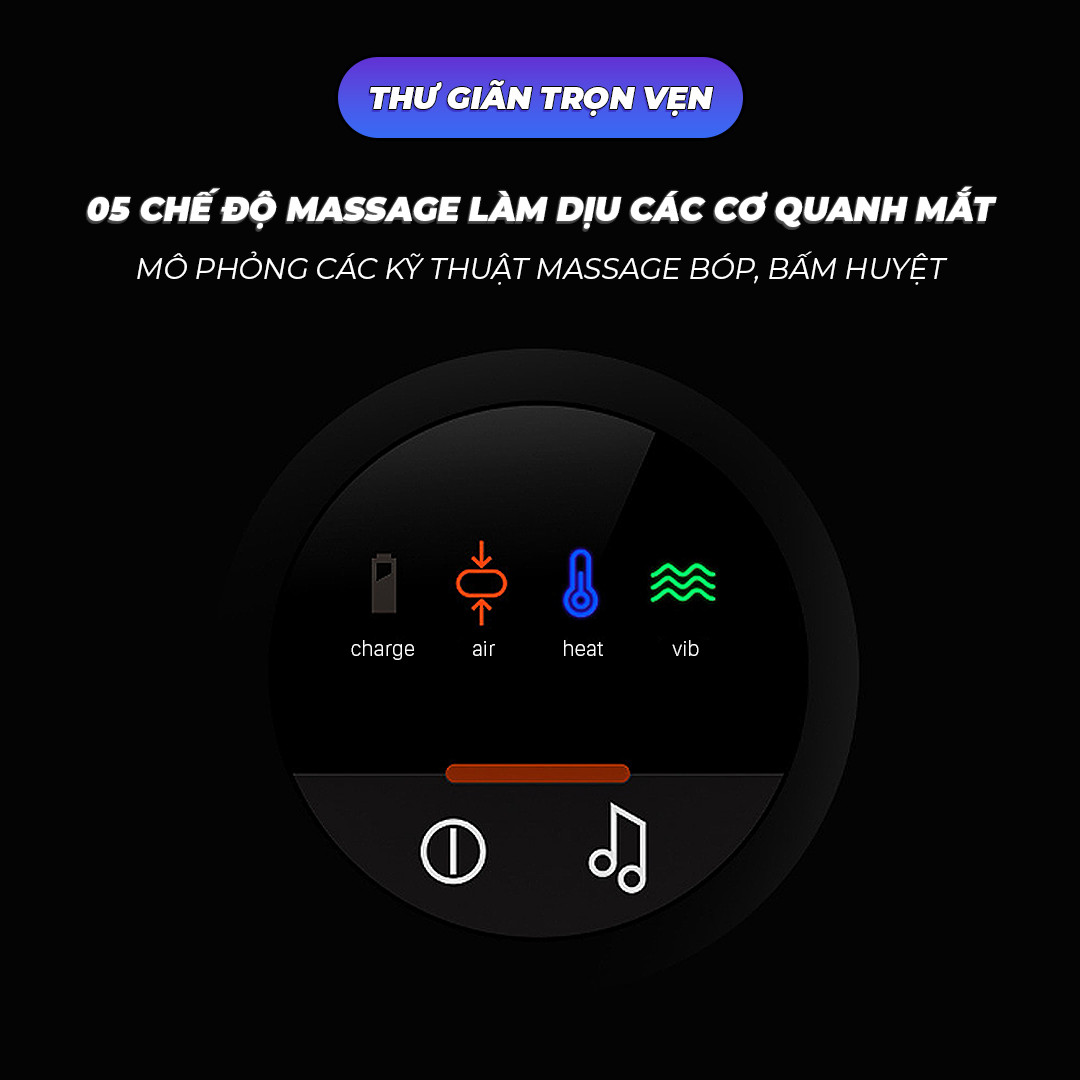· Sản phẩm áp dụng công nghệ túi khí, rung và chườm nóng được mô phỏng kỹ thuật massage truyền thống, tác động đa điểm tới nhiều huyệt đạo ở vùng mắt: